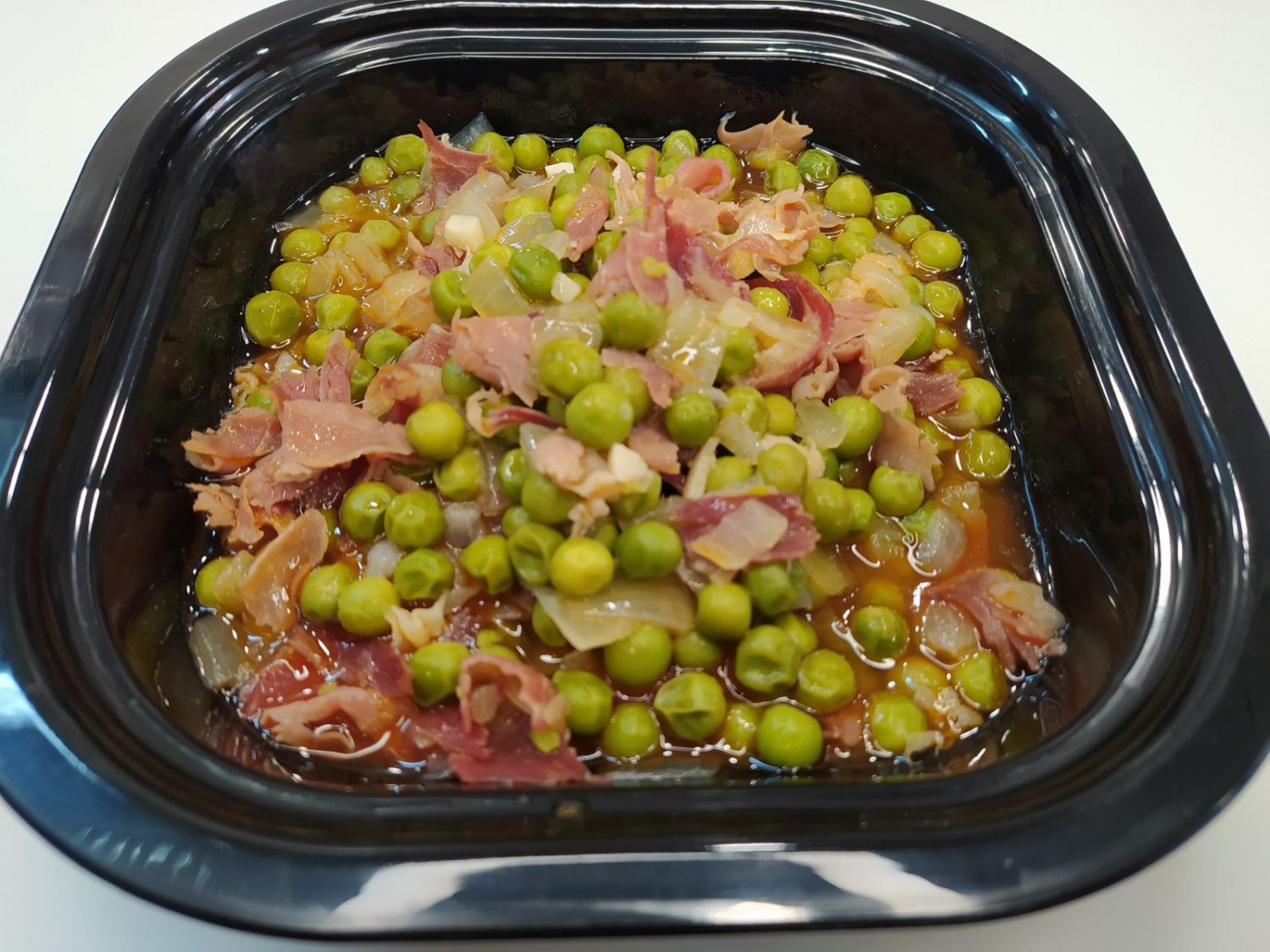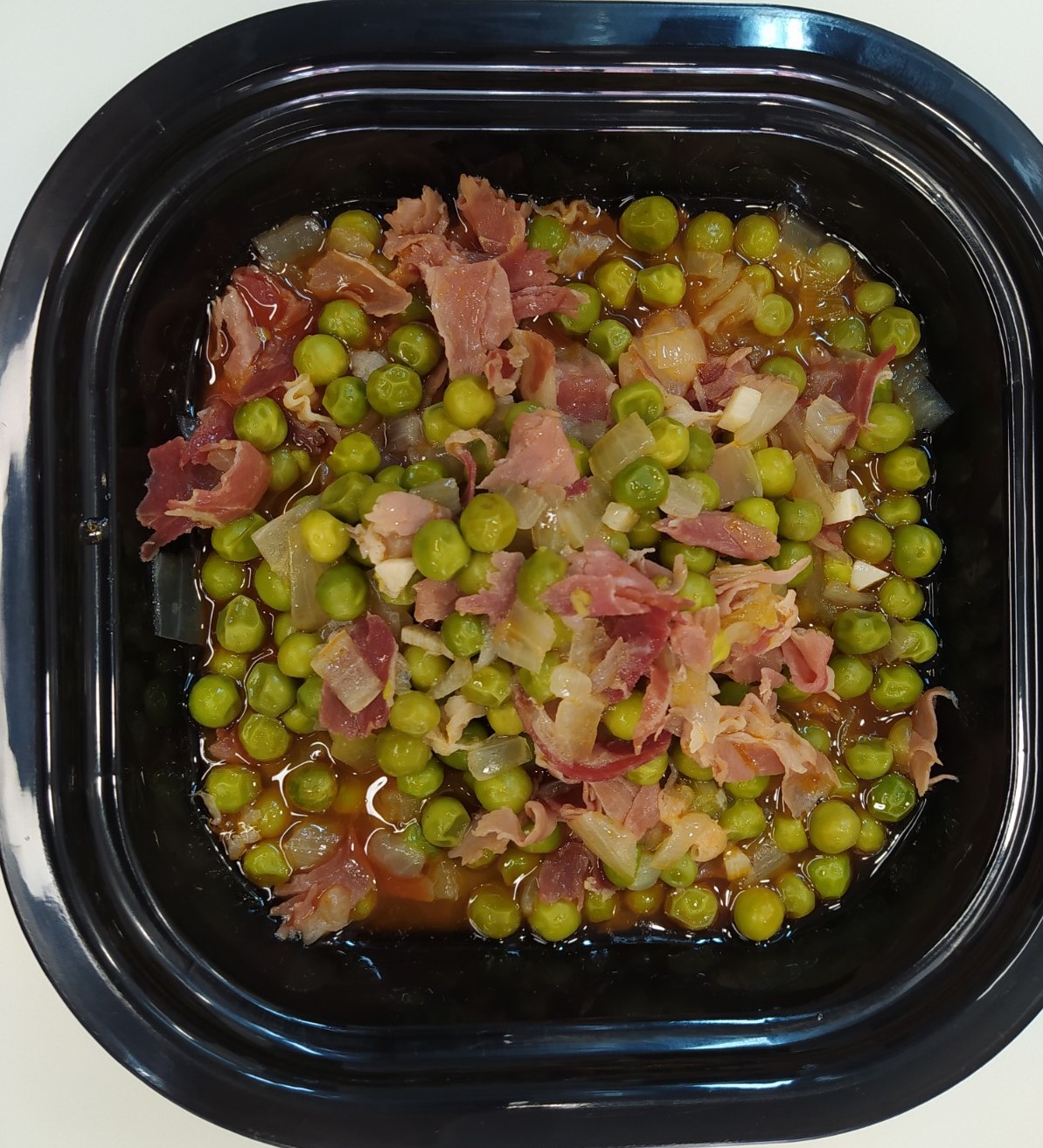 Ingredientes: Guisantes, cebolla, jamón curado, vino blanco (sulfitos), aceite de oliva virgen extra, ajo, pimentón y sal.